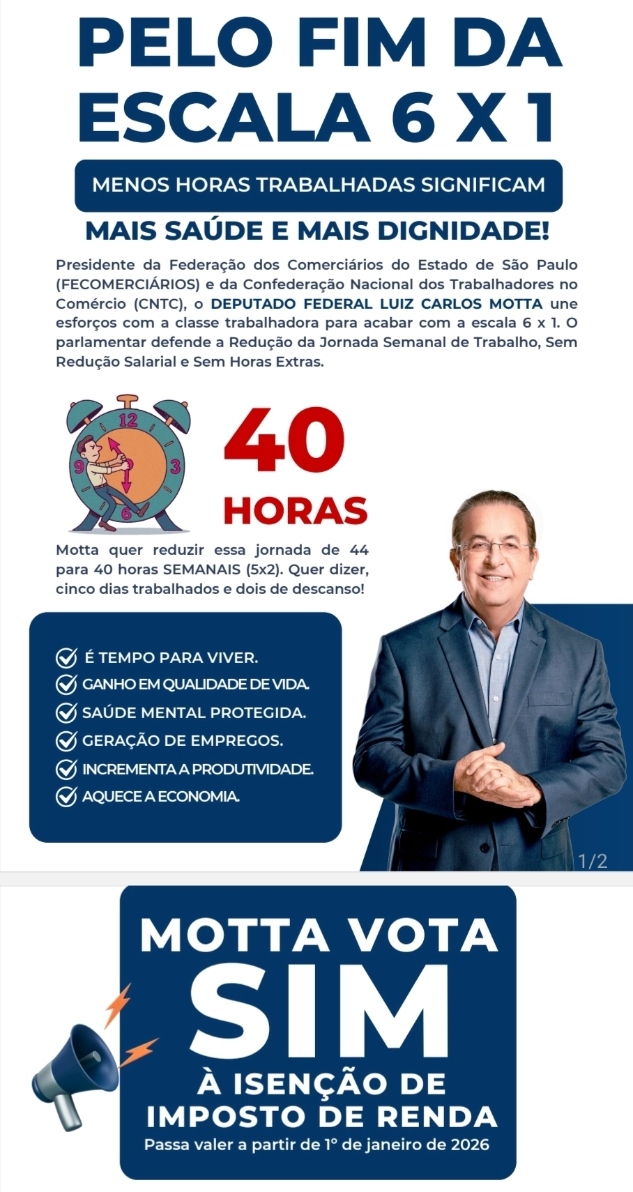 Em entrevista ao presidente do Sincomerciários/Bauru, Cilso José de Moraes, Motta afirmou que acredita na aprovação da medida, ainda em 2026.